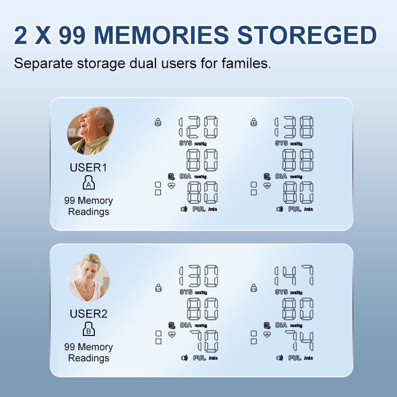 - Kényelmes kétfelhasználós mód: Akár 240 mérési eredményt is tárol két felhasználó számára, így a mérések könnyen nyomon követhetők és összehasonlíthatók.