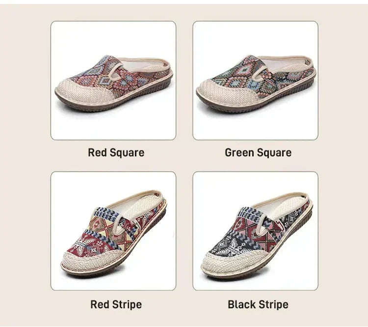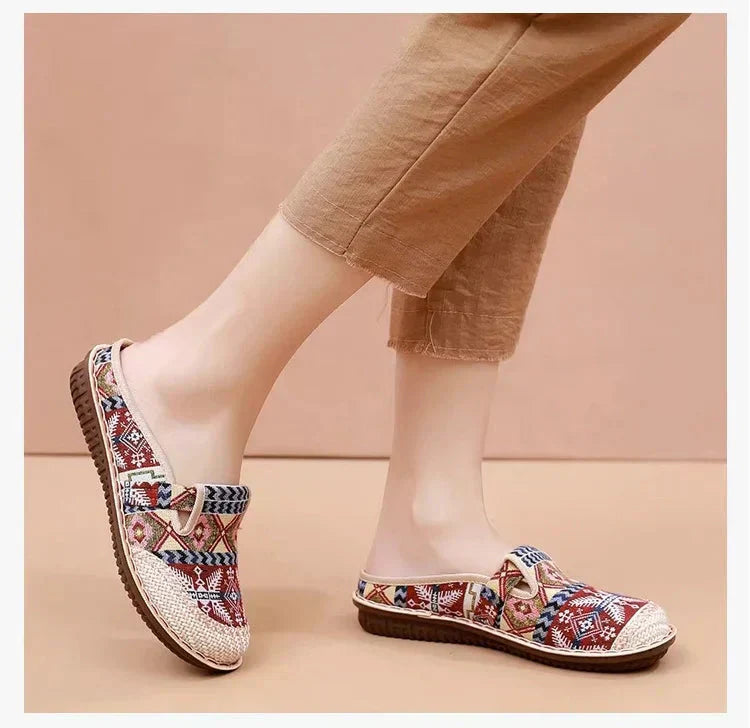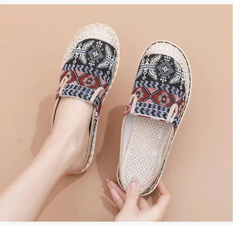 Ez egy pár mindennapi cipő pamutból és lenből. A felsőrész pamutból és lenvászonból készült, így légáteresztő és kényelmes mindennapi viselet. A cipő sarka rövidebb, így könnyebben fel- és levehető. A felsőrész mintája színes és etnikai jellegű, ami divatos karaktert kölcsönöz a cipőnek. A talp puha, jó tartást és kényelmet biztosít hosszabb járás közben. Ezek a cipők nem csak jól néznek ki, de nagyon praktikusak is, tökéletesek a mindennapi utazáshoz.